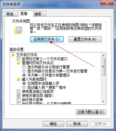 2、点击“计算机”左上角的“组织”,选择“查看”选项卡,点击“应用到文件夹”按钮》确定即可: